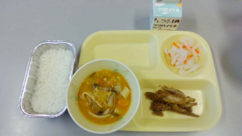 今日は、みそ味の汁の中に、かぼちゃと山梨県の特産品の「ほうとう」と呼ばれるめんが入っています。