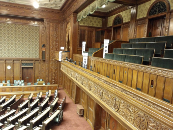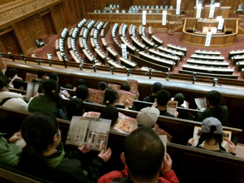 新聞やテレビなどで目にする衆議院の本会議場では、傍聴席の椅子に座り、説明を聞くことができました。壮麗さと歴史的な重みを肌で感じ、子供たちはいつもよりも緊張した様子でした。