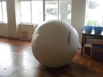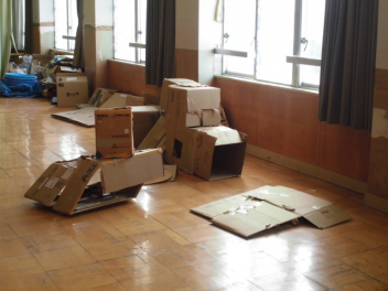 プログラムの表紙絵の優秀作品の掲示、競技に使う大玉や手づくりの障害物、演技に使う衣装や手づくりの旗、張り出された学年の練習計画、等々。