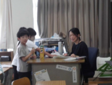 中には、先生の机の周りやオルガンの周りに集まって、先生と一緒に楽しそうに過ごしている子たちもいます。