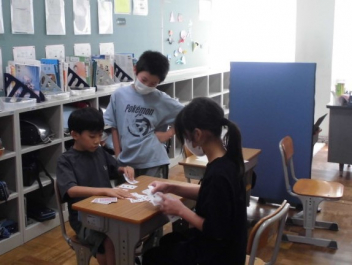 カードゲームや積み木をして遊んだり、友達とお話したりして楽しんでいる2、3、4年生。