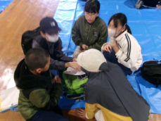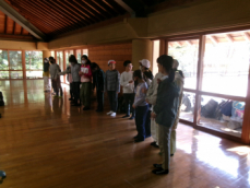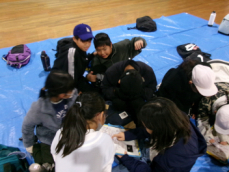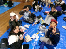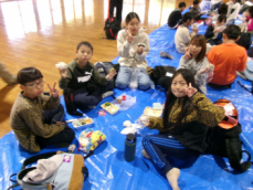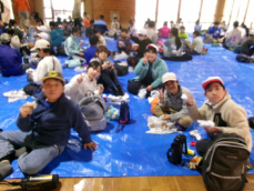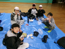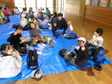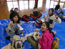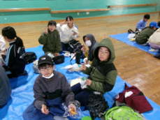 入所オリエンテーションを終え、午後に行う「ポイントハイク」の準備をし、宿泊棟を出発。体育室へ集合して、昼食をとりました。当初は、屋外で、かわなの空気を感じながら、持参したお弁当を食べる予定でしたが、クマ対応のため体育室での食事となりました。