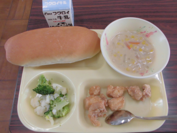 今日の給食は「パン、牛乳、鶏肉の米粉揚げ、はなやさい、コーンクリームスープ」でした