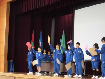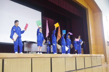 まず1時間目の「縦割り集会」では、縦割り団のペアと色が決まりました