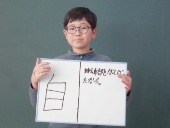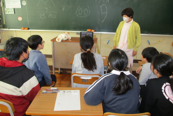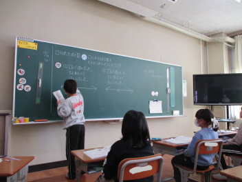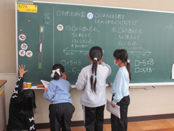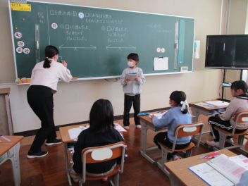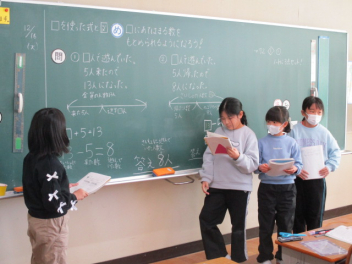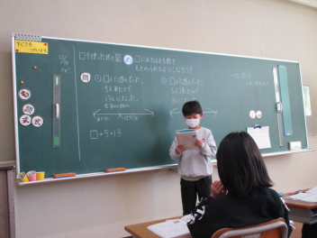 3年生は算数で「□を使った式」の学習をしていました。問題文から数直線を使って問題場面を図式化し、そこから□に当てはまる数を式に表して求めていきます。3年生はどの子も、その子なりに自分の考えをノートにしっかりと書くことができます。今日はそこから、みんなに自分の考えを説明できるようにグループで一度考えを説明し合って確認し、その後、全体に発表するのをがんばっていました。相手を意識しながら、より分かりやすい説明を考えることは、本当に理解していないとできないことです。うまくできないことも多いですが、何回もやってみることが大切。あきらめずにがんばっていこう
