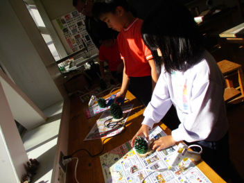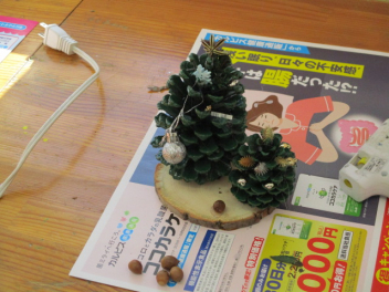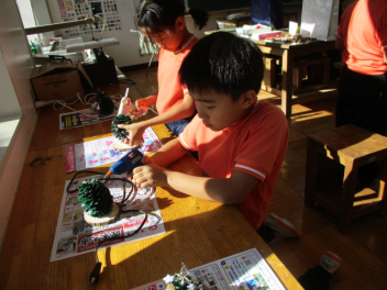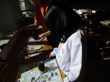 2年生は生活科の学習で秋のものを使い、クリスマスツリーづくりをしていました。大きな松ぼっくりに色を付けたものに、いろいろな秋の木の実を飾り付け。ホットボンドの使い方も上手にできていました。友達の工夫も参考に見合いながら仕上げていました。作りながら「サンタさん、くるかなあ」とクリスマスを楽しみにしていましたblush