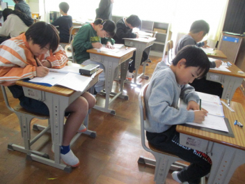 3・4年生は、書写の授業で書き初めに取り組んでいました。3年生は書き初めがはじめての子もいて、長い紙と太い筆に苦戦している様子も見られましたが、みんな真剣に集中して取り組み、お手本に倣った字を書くことができていました。