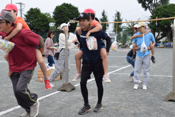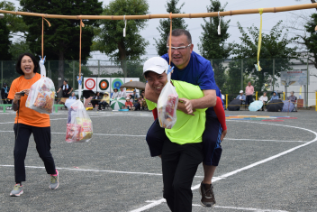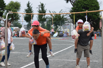 スタート時には、出走する人が自分の名前を元気よく言います。そして、最初はむかで競争。親子で力を合わせて進みます。次は風船を棒で挟んで進みます。その風船を用意された椅子まで運び、そこで割ります。その後、平均台を親子で渡り、最後は子供をおんぶかだっこか肩車をして走りお菓子をとってゴールwink なかなかうまくいかなかったりハプニングもあったりで、みんな笑顔いっぱいの競技になりましたsad