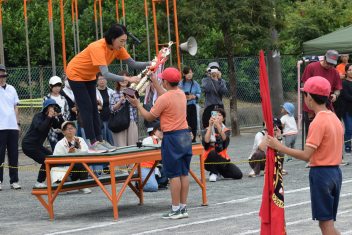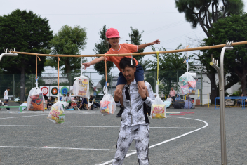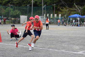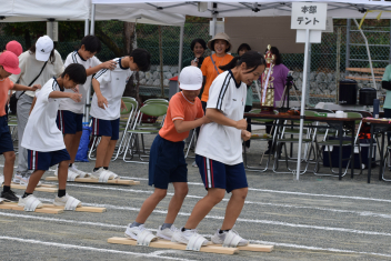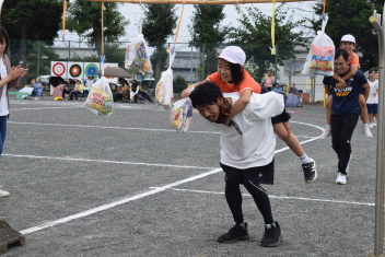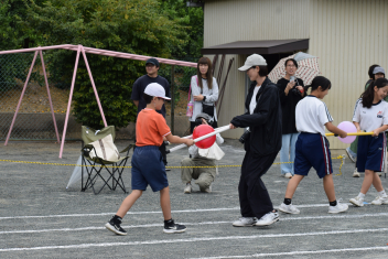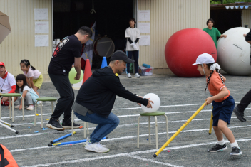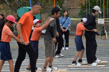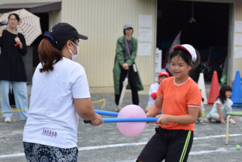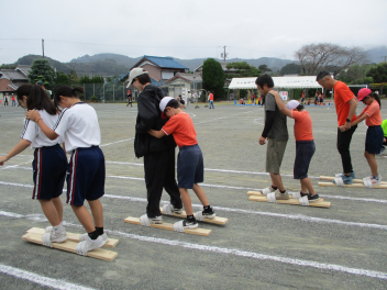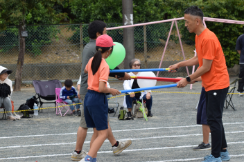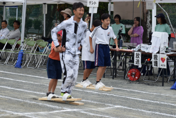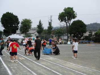 まず最初にPTA種目sad その名の通り、親子で出場する種目です。PTA役員の皆さんが夏休み中に考え、準備してくださいました。手作りの用具もありました!ボランティアで来てくれていた本校卒業生の中学生も多数飛び入り参加してくれました。