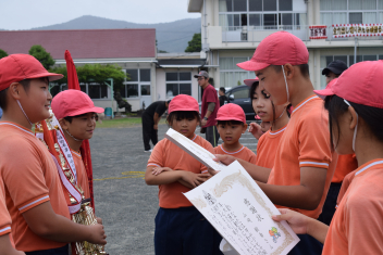 閉会式のあと、赤組、白組ともに解散式を行いました。リーダーを務めた6年生一人ひとりから、ともに頑張ってくれたメンバーへメッセージを送りました。その後、メンバーからのメッセージのお返し。最後にみんなで互いに拍手をして解散…というところで「ちょっと待ったー」5年生からサプライズの、6年生への感謝状贈呈frown 6年生一人ひとりへ気持ちのこもった感謝状が贈られました。 みんなとてもうれしそうでした。
