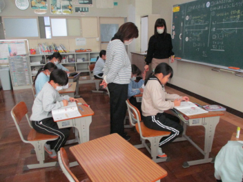 5・6年生は算数の学習。授業の終わりには、今日習ったことやこれまでに学習したことをしっかりと身に付けるために、練習問題に挑戦しています。みんなあきらめずに真剣に課題に取り組んでいて感心します。分からないところは先生がそばについて丁寧に教えてくれるので安心ですねlaugh