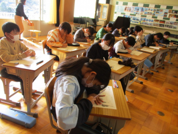 3・4年生は、書写の授業で書き初めに取り組んでいました。3年生は書き初めがはじめての子もいて、長い紙と太い筆に苦戦している様子も見られましたが、みんな真剣に集中して取り組み、お手本に倣った字を書くことができていました。