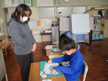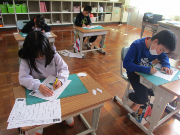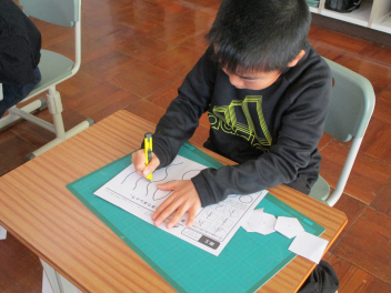 午前中、2年生の教室では図工の時間にカッターナイフの練習をしていました