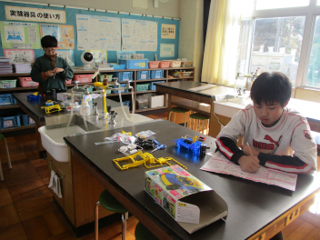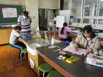 理科室では、5年生が実験キットを使って、電磁石の性質を調べる実験をしていました