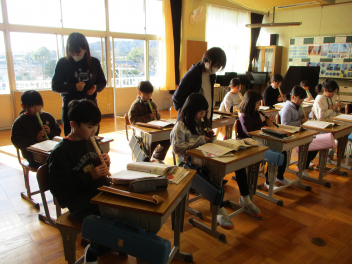 音楽室では、3・4年生がリコーダーの練習をしていました