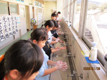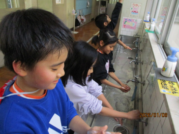 冷たい水ですが楽しみながら頑張って手洗いうがいをしています。