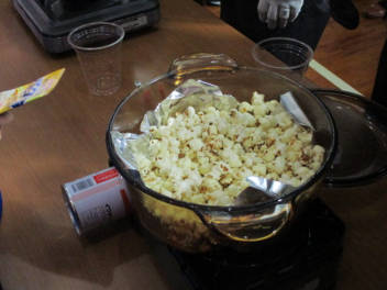 鍋を熱して、油やバターを入れ、自分たちで収穫、脱穀したイエローポップを入れました。
