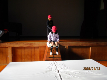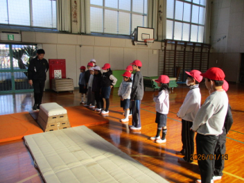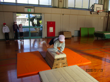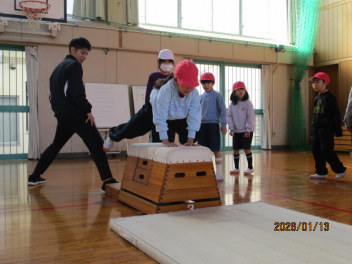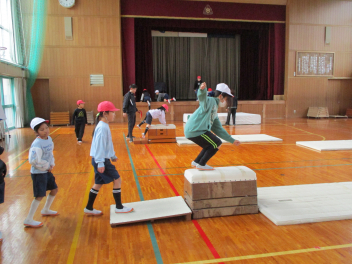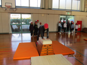 両足で踏切り→両足でジャンプ→着地、パーの手を前にしっかりつくなどひとつひとつの動作をみんなで確認しながら跳びました。2回目、3回目と繰り返していくうちに、「できた!」と成功するようになりました