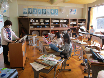 3年生は音楽。みんなで「茶色の小びん」の合奏に取り組んでいました。