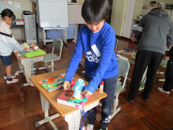 6年生は図画工作の授業。作品バックに自分が好きなイラストを描いていました 6年生ともなると、とても上手でびっくりcool ほしくなるようなバックに仕上がっていました。