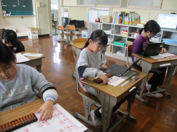 3年生は算数の授業。そろばんの学習です。タブレットで動画を見ながら取り組んだり、ワークを見ながら実際にそろばんでの計算に取り組んでいました。終わりごろにはだいぶ慣れてきてぱちぱち計算できていましたwink