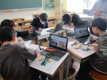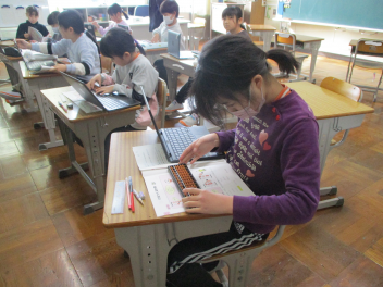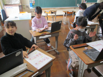 6年生は国語で、卒業に向けて6年間を振り返る作文を一生懸命考え、文案をタブレットで打ち込んでいました。