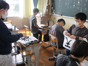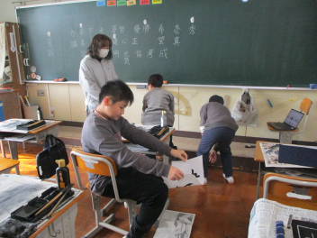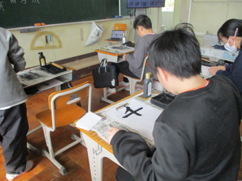 書写の授業では、自分の好きな漢字一字を丁寧に毛筆で書く練習をしていました。卒業式の会場にも飾ろうかと検討中frown