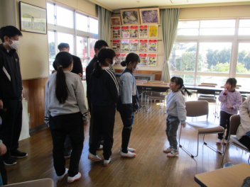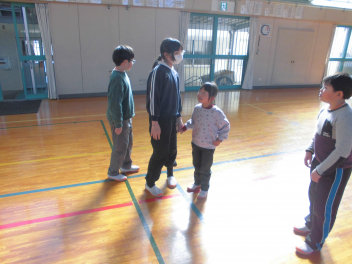 2・3年生は体育の授業です。最初にみんなで「かわりおに」をやって体を十分に動かしていました
