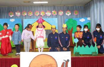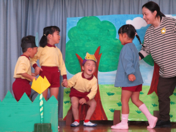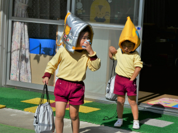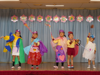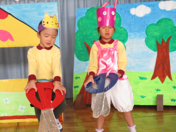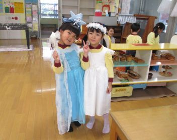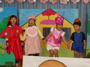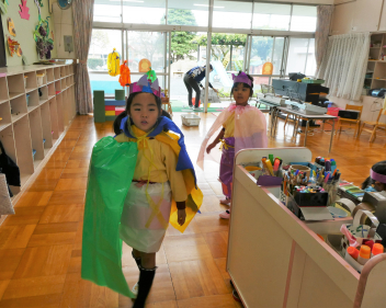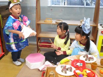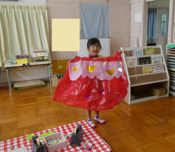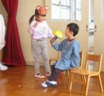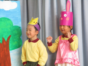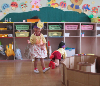 園に戻ると、先週行った発表会の劇を、今日は本番の役とは違う自分のやってみたい役でやってみましたsad