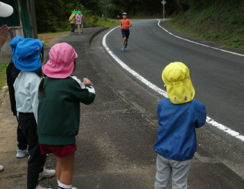 小学生が一生懸命走る姿に「がんばれ~!」と声援をおくるこどもたち・・・