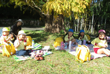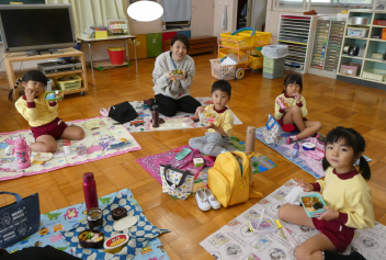 今日は、戸外でお弁当を食べました