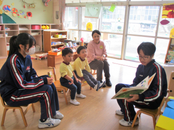 一生懸命読んでくれる中学生と絵本をじっと見つめて聞いている幼稚園の子sad・・・いい時間が流れていましたよ