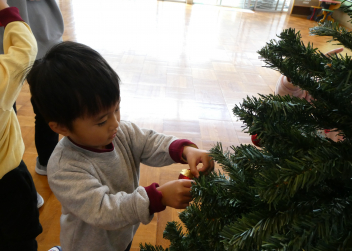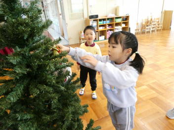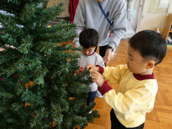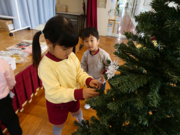 みんなで、クリスマスツリーに飾りを付けましたsad
