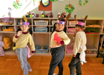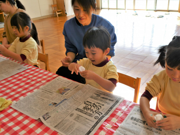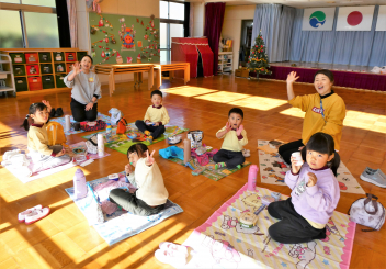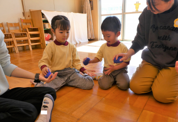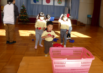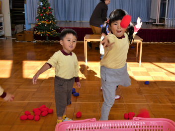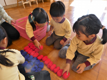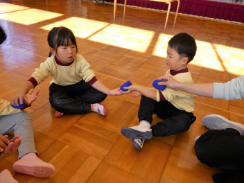 歌に合わせて横のお友達に玉を渡すゲームでは、一人の子が2個も3個も持ってしまうこともありましたが、リズムに合わせて遊ぶおもしろさを少しずつ感じながら、楽しんでいましたsad
