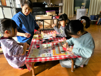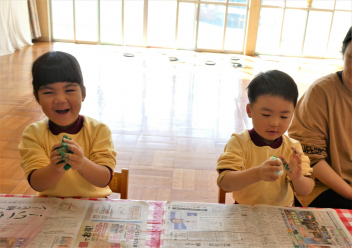「よーいドン」で同じ色の玉を2個取るゲームでは、回数を重ねるうちに、自分なりのやり方を見つけ出す姿も見られましたよfrown