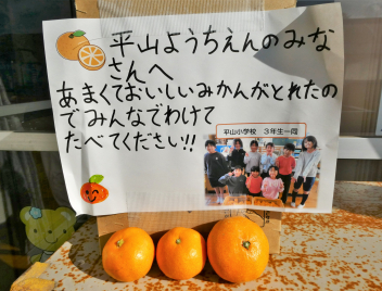 午後には平山小の3年生が、授業で収穫したミカンとひまわりの種を届けに来てくれましたfrown