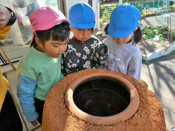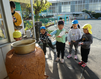登園してすぐに、いつもと違う炭の焼ける匂いに気づいたこどもたち・・