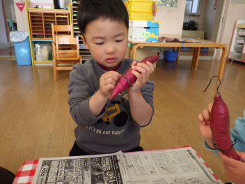 硬かったけれど、どの子も針金に芋をさすことができましたsmiley