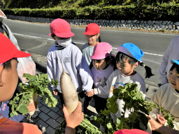 校門に着くと、大根の収穫をしていた小学生とバッタリ出会い・・・