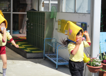 昨日うさぎ・りす組が隠しておいたピンクと黄色のお宝を、今日はきりん組さんが探しました
