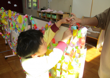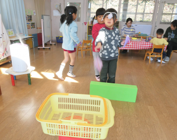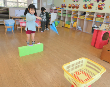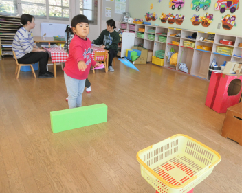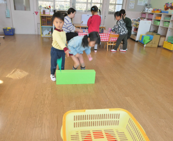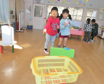 小さいお友達に折り方を優しく教えてくれる子、どうやったらうまく飛ぶか試しながら何度も試行錯誤してみる子、籠に入ると10点獲得というルールだったので、友達と点数の獲得を競い合ったり・・など、いろいろな姿が見られていましたよsad
