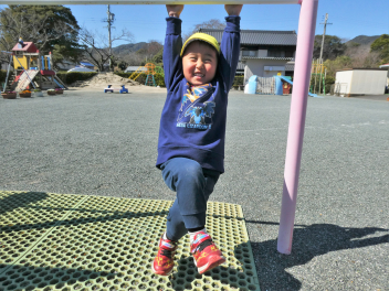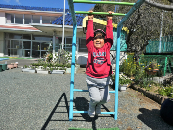 鉄棒でのぶら下がり・・・足を組む余裕も出てきましたfrown