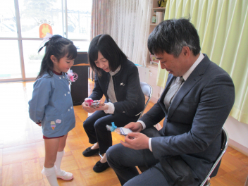 きりん組からも、「○○組、頑張ってね!」と、キーホルダーのプレゼントをもらい、笑顔いっぱいのうさぎ・りす組さんsad