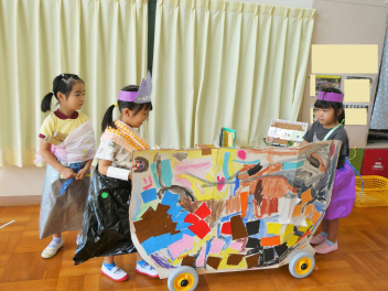 先々週から、自分たちの着る服や海賊船、宝物などを作りはじめ、海賊ごっこを楽しんでいるこどもたちwink