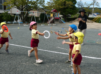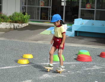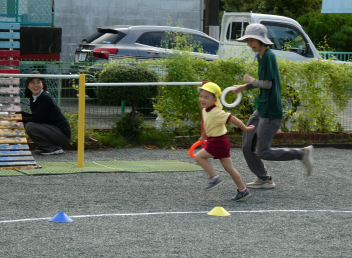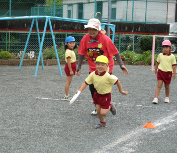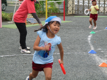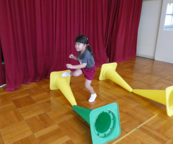 「これ、やってみよう!」と、自分で選んでやってみたり、「バトン出して!」と、こども達の声から準備が始まったリレー遊びの姿が見られたり・・・少しずつ、体を動かして遊ぶことの楽しさを感じてきている様子ですfrown