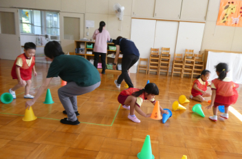 遊戯室でも、コーン倒しやジャンケン汽車などの触れ合い遊びを楽しみましたsad