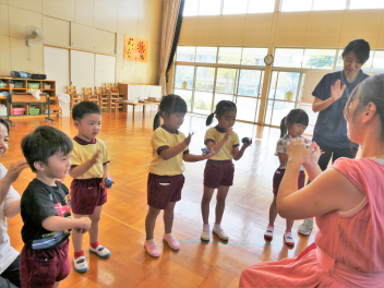 • 今日は、地域の講師の方を招いてのリズム遊びがありましたsad