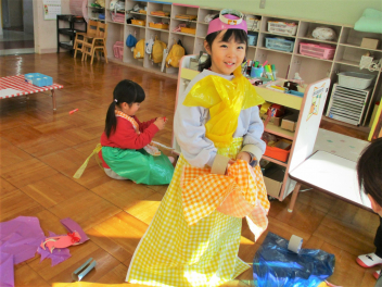 お寿司屋さんになったり、なりたいものになる変身グッズを作ったり、こま回しに挑戦したりと、友達と一緒に遊ぶ楽しさや自分なりにやってみるおもしろさを感じながら遊んでいましたよsad