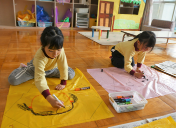 年中さんは、グルグル渦巻をはさみで、慎重に切って凧を作っていましたよfrown