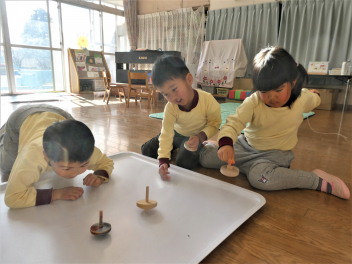 糸の巻き付け方やこまの回し方に苦戦していましたが、年中・年長さんは、繰り返し挑戦していました